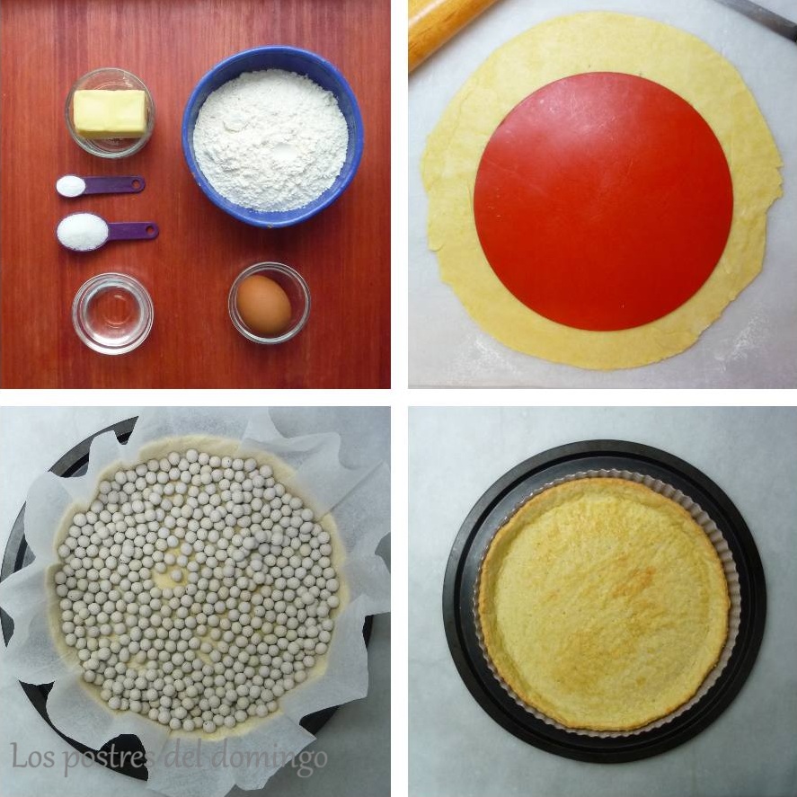 Poner la harina tamizada con la levadura en una ensaladera, añadir la mantequilla en trocitos. Mezclar hasta que parezca serrín, añadir el huevo y el agua en tres veces, formar una bola y dejar tapada en sitio fresco. Extender con un rodillo hasta un grosor de unos 5 milímetros y forrar un molde desmontable de 26 cm. Pinchar el fondo con un tenedor, cubrir con papel de horno y poner peso encima, como se ve en la foto.