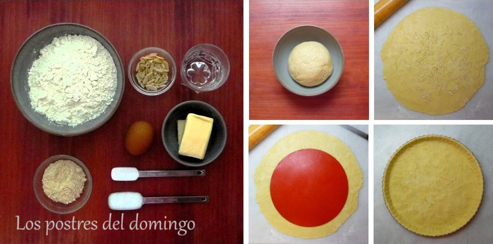 Poner la harina con la levadura, el azúcar y la almendra molida en una ensaladera, añadir la mantequilla en trocitos. Mezclar hasta que parezca serrín, añadir el huevo y el agua en tres veces, formar una bola y dejar tapada en sitio fresco. Dividir en dos partes desiguales, una un poco mayor que la otra. Extender la mayor con un rodillo, repartir las almendras en bastones apretando para que se claven en la masa. Forrar un molde desmontable de 26 cm de diámetro. Pinchar el fondo con un tenedor y conservar en frío mientra se hace el relleno.