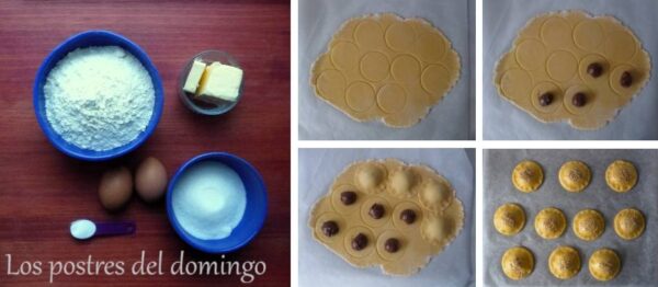 Tamizar la harina con la levadura en polvo y añadir a la mezcla anterior, amasar hasta que se forme una bola, dejar tapada en sitio fresco. Dividir la masa en dos partes iguales, extender la primera con un rodillo y marcar círculos de 6 cm.