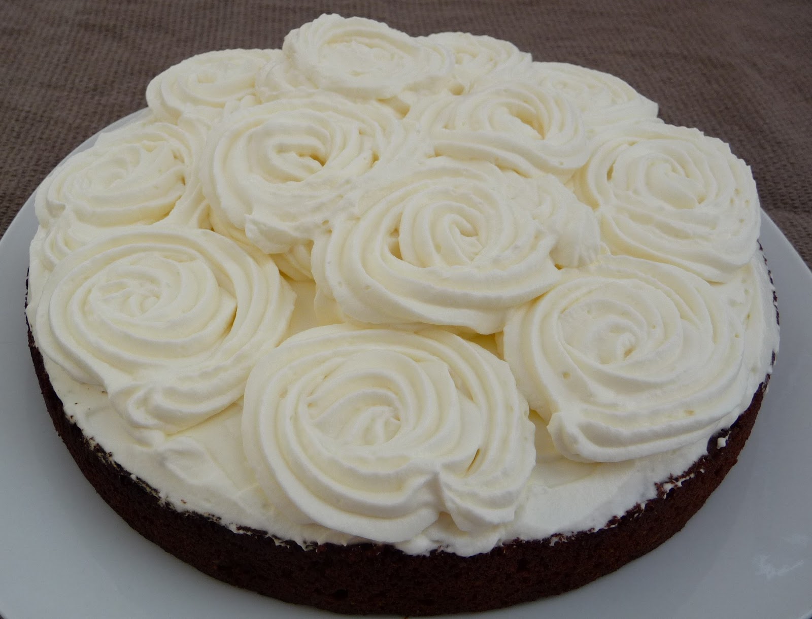 Se cubre con una buena cantidad de nata montada (400 ml) y se espolvorea con cacao amargo en polvo. La combinación, chocolate, avellana, nata es estupenda. Se puede tomar como postre o con un café o te.