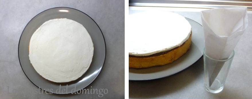 Preparar un cucurucho de papel vegetal, llenar con el chocolate fundido, dibujar unos hilos cruzados sobre la nata.