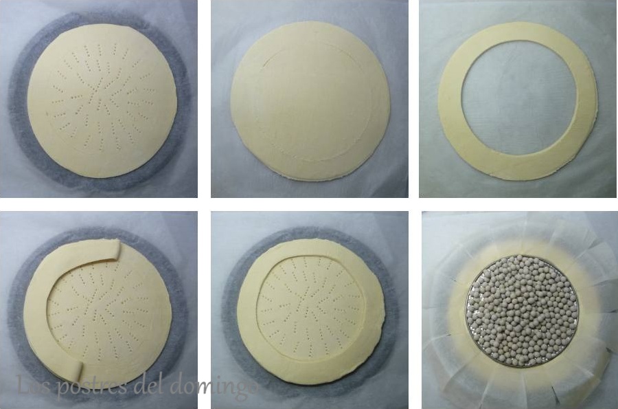 Estirar cada mitad con el rodillo entre dos hojas de papel de horno dejándola de 5 mm de espesor. Con un cuchillo afilado cortar dos discos de 28 cm, colocar uno en la bandeja del horno cubierta con papel vegetal. Marcar un círculo de 21 cm y pinchar toda la superficie, respetando el borde, como se ve en la foto. En el segundo disco, recortar un círculo de 21 cm, colocar el aro resultante sobre el primer disco, humedeciendo el borde para que se pegue. Poner en en centro un papel vegetal y peso para que no suba.